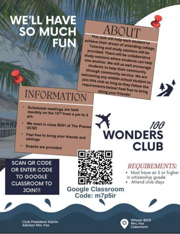 The club creates a space where students can develop leadership skills, work together on meaningful projects, and inspire each other to create positive change. By encouraging teamwork and responsibility, 100 Wonders helps students grow into confident leaders who care about making their world a better place.